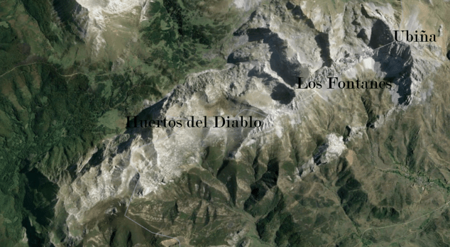 A vista de pájaro, se perciben los restos de lo que fue un macizo mucho más compacto, un gigantesco pliegue, del que queda al sur la rugosidad de la Ubiña. Pero el tiempo hizo que esa mole se fuese desmoronando hacia el norte, donde actualmente solo queda la espina de esa enorme protuberancia geológica. Esa espina surge abruptamente desde la verticalidad de la pared norteña de la peña que da nombre al macizo y se dirige hacia el norte a través de Los Castillines y Los Fontanes. Más al norte, cuando parece que la espina dorsal de este animal descuartizado tiende a suavizarse, es donde se levanta el espinazo que los humanos llaman Los Huertos del Diablo.