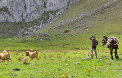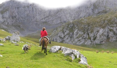 Los pastores (hombre y mujer) nos dieron toda esa información que no viene en los dispositivos móviles, pero que configuran la esencia y la identidad del pastoreo y, por extensión, de la montaña. No usan caballos porque las mulas son más robustas, fiables y, además, comen menos. Llevaban dos perros Collins, madre y cría de cuatro meses, porque son muy hábiles para manejar el ganado, como es conocido por los pastores de toda Europa. Nos dijeron que los mastines se dedican para que el ganado se sienta seguro de sus depredadores.