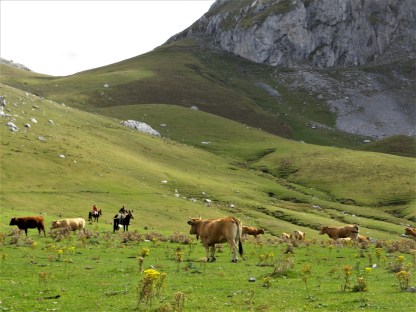 Fue lo que ocurrió esta semana en los límites entre Lena y Quirós, en la braña del Chegu, cuando bajábamos de la Carba de Valseco. Vimos una manada de vacas que corrían a gran velocidad en dirección a la citada braña. Por cierto, el toro iba el último tirando como podía de sus pesados atributos. Detrás, dos pastores, que iban sobre mulas, dirigían con diligencia el ganado.