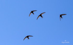 Por encima, siempre los gorriones, acompañados ahora por los vencejos, recién llegados de tierras lejanas. Dos especies opuestas en su comportamiento. Frente al carácter hogareño de los gorriones, nuestros fieles compañeros en todos los momentos, nos llama la atención la actividad frenética del vencejo, que se pasa toda la vida en el aire donde se alimenta, duerme y copula. Ajeno a nuestra presencia en el mundo, solo baja a tierra para cuidar de su camada.