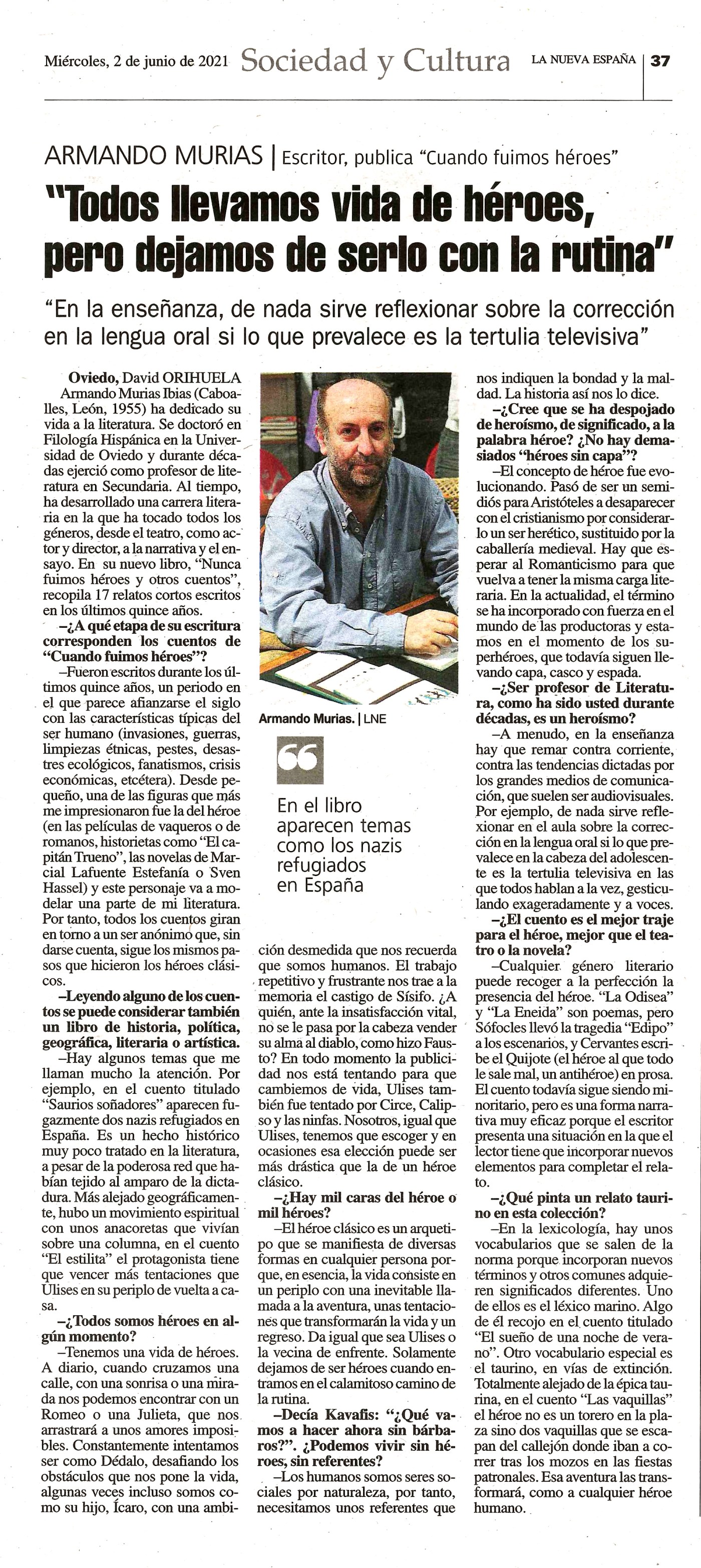 Armando Murias Ibias (Caboalles, León, 1955) ha dedicado su vida a la literatura. Se doctoró en Filología Hispánica en la Universidad de Oviedo y durante décadas ejerció como profesor de literatura en Secundaria. Al tiempo, ha desarrollado una carrera literaria en la que ha tocado todos los géneros, desde el teatro, como actor y director, a la narrativa y el ensayo. En su nuevo libro, “Nunca fuimos héroes y otros cuentos”, recopila 17 relatos cortos escritos en los últimos quince años.