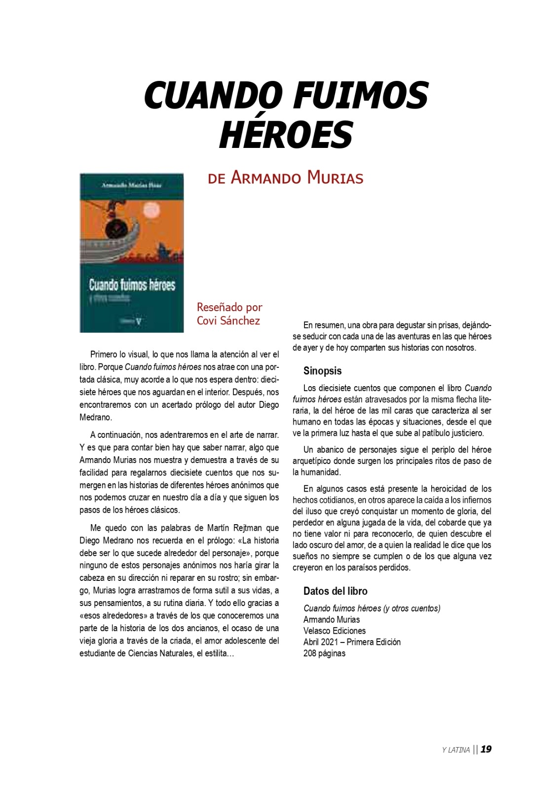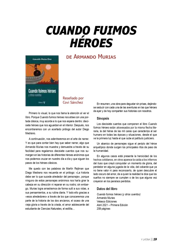 Covi Sánchez, crítica literaria y presidenta de la Asociación de Escritores Noveles, reseña en la revista Y LATINA el libro de cuentos CUANDO FUIMOS HÉROES.