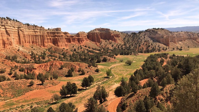 En el Cañón Rojo de Teruel el suelo arcilloso está moldeado por las esporádicas torrenteras de agua que forman enormes cárcavas y barrancos improductivos. Fueron las gentes norteafricanas las que supieron producir ladrillos con estas estas tierras arcillosas para así construir las torres mudéjares de la ciudad de Teruel. Por los alrededores se pueden ver algunas sabinas y carrascos, testigos mudos, pero expresivos de una desertización que esteriliza la faz de esta tierra roja.