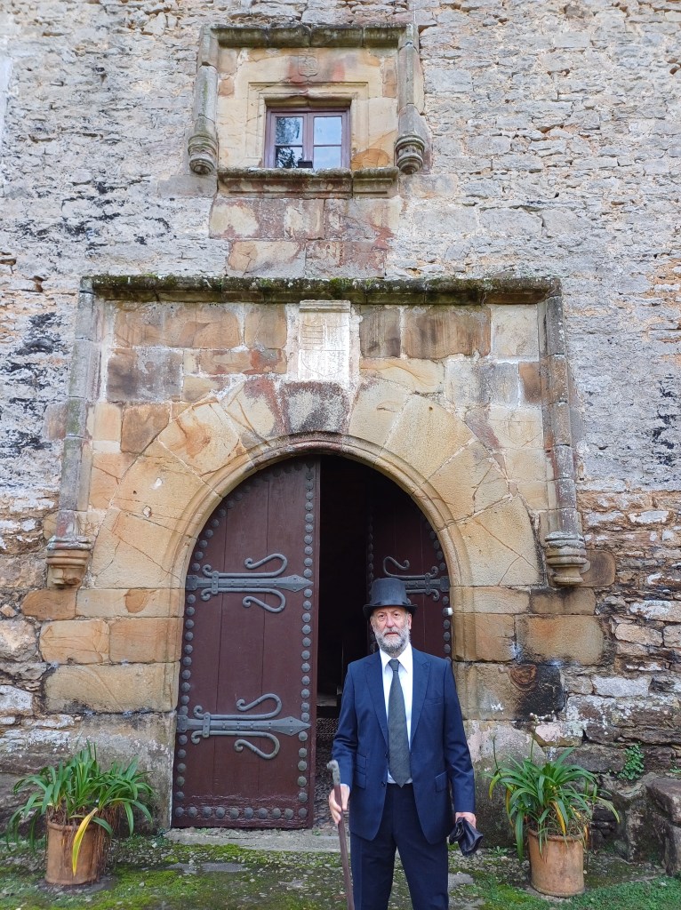 En otras ocasiones, el viaje es de ida y vuelta. Aquí estoy vestido a la manera de finales del siglo XIX. Represento a los ojos actuales la figura del comandante Antonio Reina, que ejerció el papel de juez en el duelo a primera sangre que enfrentó en 1892 a los escritores Emilio Bobadilla y Leopoldo Alas, Clarín, una práctica prohibida desde los Reyes Católicos, aunque frecuente en determinados ambientes culturales. La foto está hecha en la entrada principal del palacio asturiano de La Doriga.