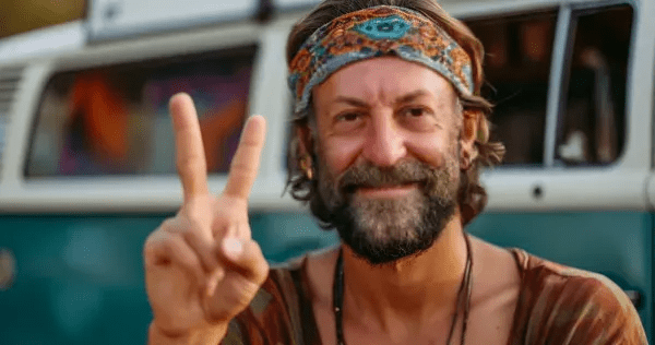 Para celebrar el mes de las flores, nada mejor que encargar a la IA que genere una foto con la estética del mundo hippy, el movimiento que hizo suyo el paisaje de una naturaleza primaveral en paz y felicidad.