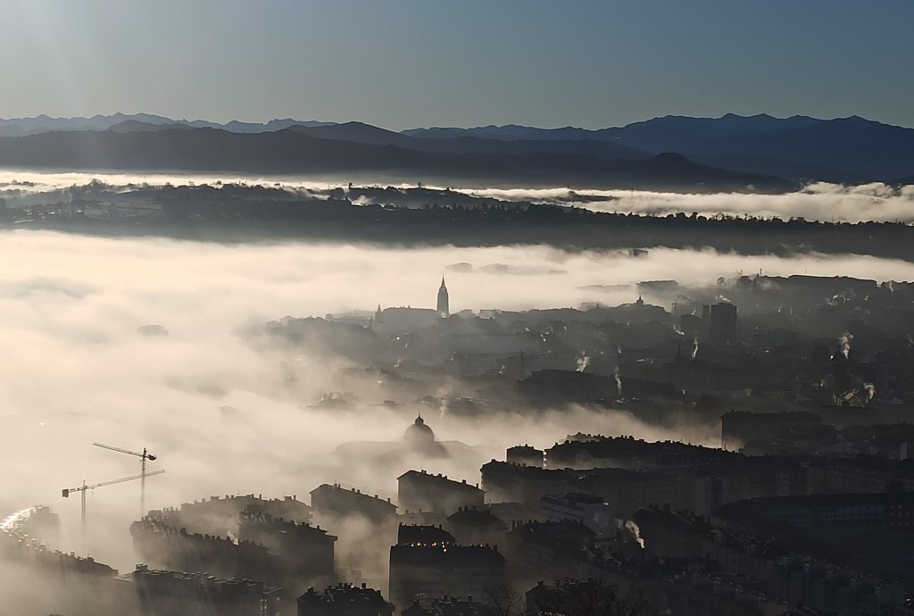 Las bajas temperaturas del invierno despejan el cielo, pero hacen que las nieblas queden pegadas al suelo, como esta fotografía de Oviedo desde la ladera del Naranco. Destacan la aguja de la catedral, la cúpula de la antigua cárcel, un par de grúas que dan fe de que la ciudad sigue creciendo y el humo que sueltan unas pocas chimeneas domésticas.